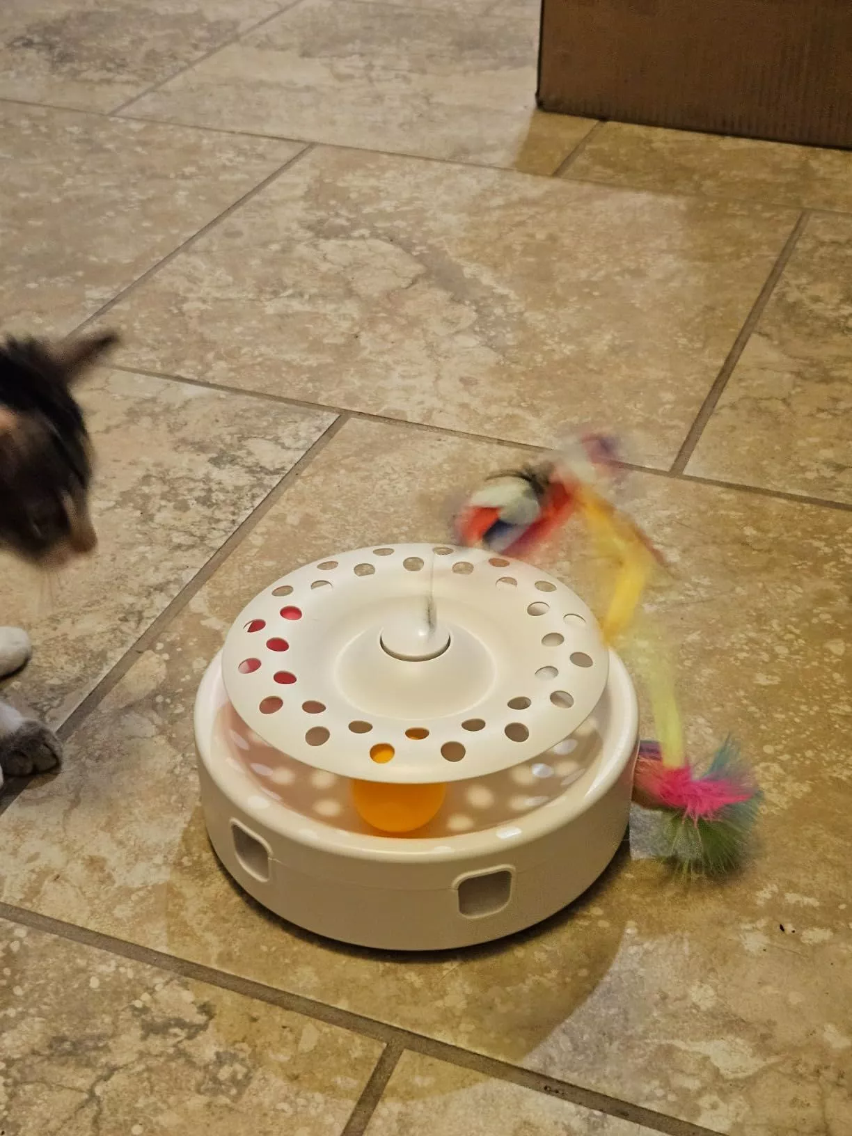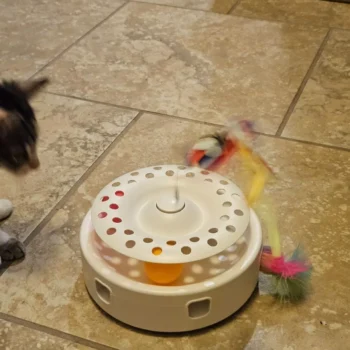 Designed to captivate and entertain, this toy combines a fluttering butterfly, a randomly moving feather, and engaging track balls into one versatile play experience. Perfect for keeping your cat active, stimulated, and happy, it’s an essential addition to any cat household.