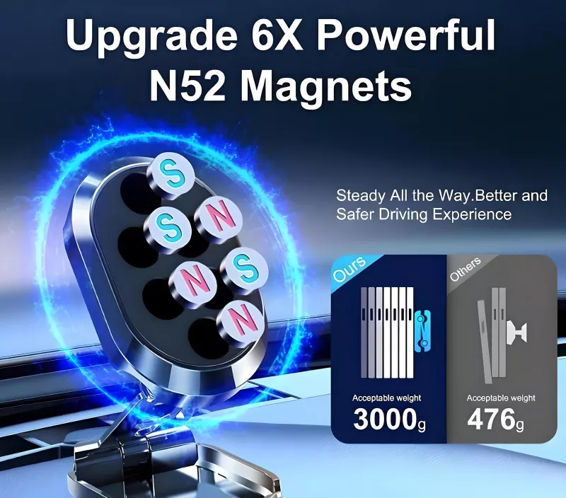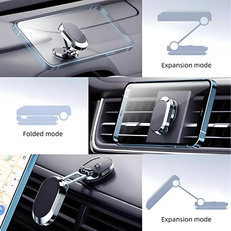 Our phone holder stands out with its combination of functionality and style. The strong magnetic attachment ensures your device stays securely in place, even on bumpy roads. The 360-degree rotatable feature allows for effortless adjustment to any viewing angle, enhancing your driving experience. Plus, its foldable and sleek design means it seamlessly integrates into your car’s dashboard without adding bulk.