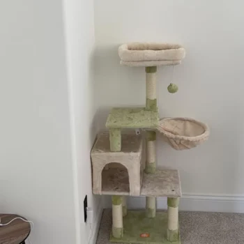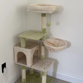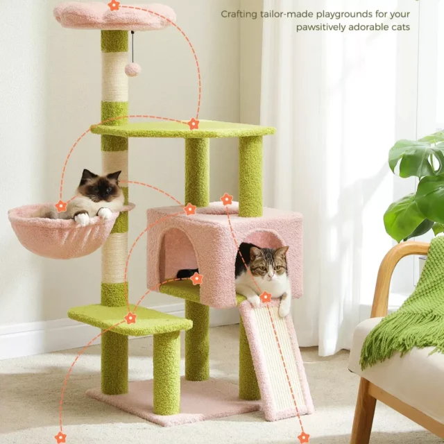 With multiple levels and platforms, this cat tree offers endless opportunities for your cat to explore and play. It features three sisal-covered scratching posts that are perfect for satisfying your cat’s natural urge to scratch while keeping your furniture safe. The various heights and spaces provide your cat with the perfect spots to jump, climb, and relax. From the cozy perch at the top to the green platforms and the comfy hammock, your cat will have no shortage of places to call their own.