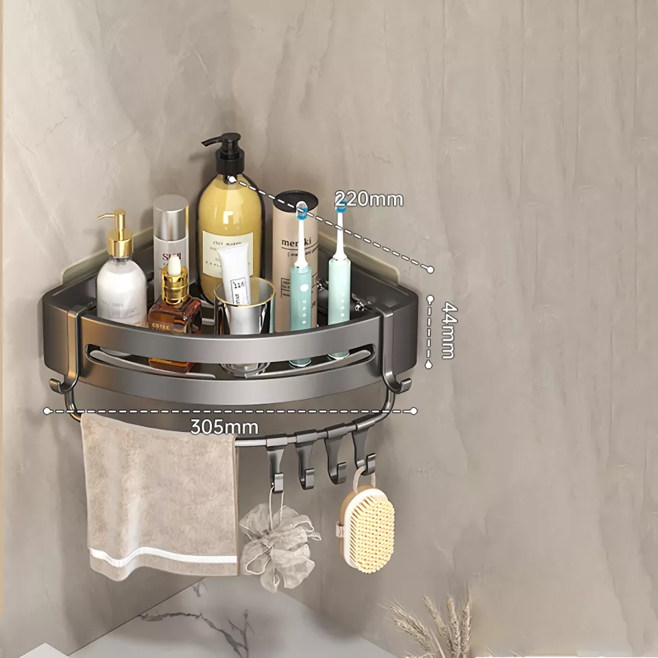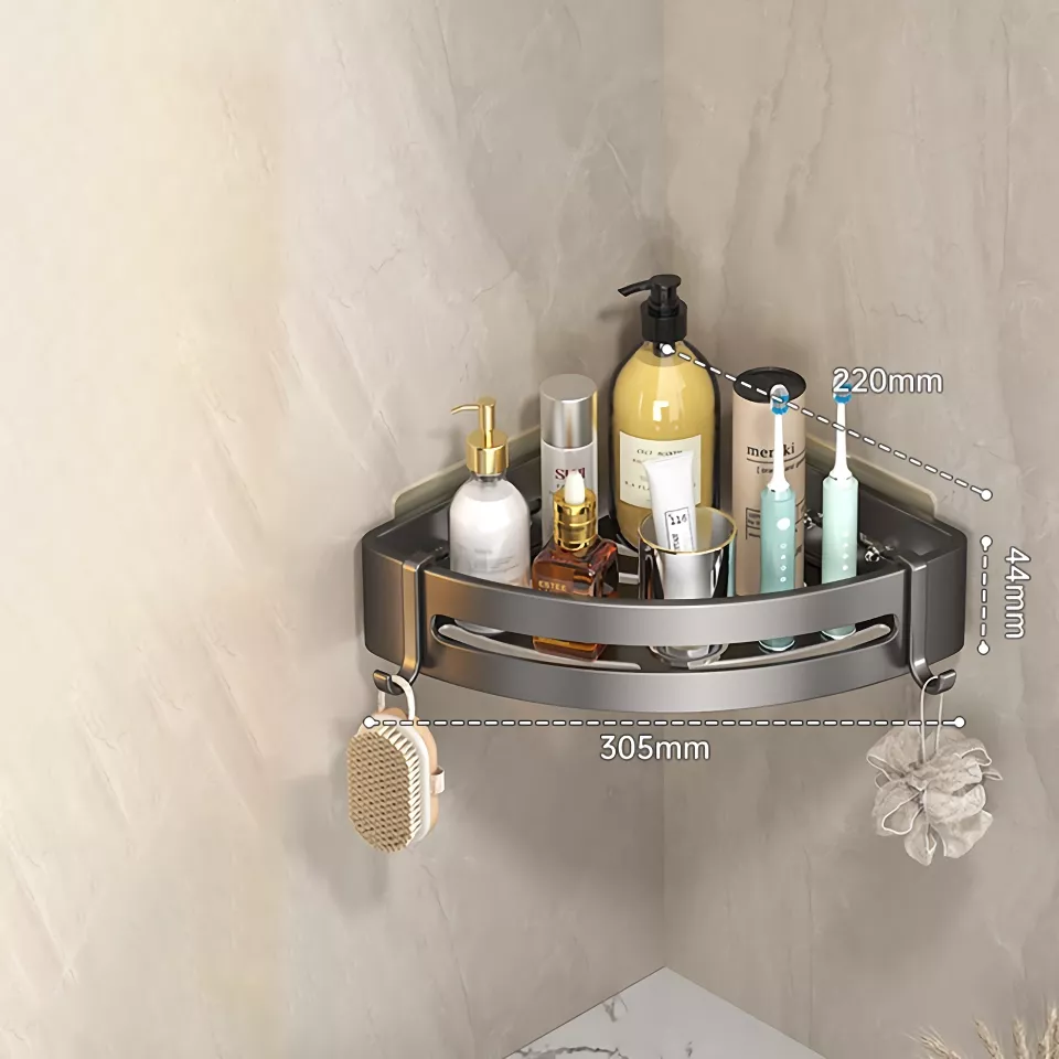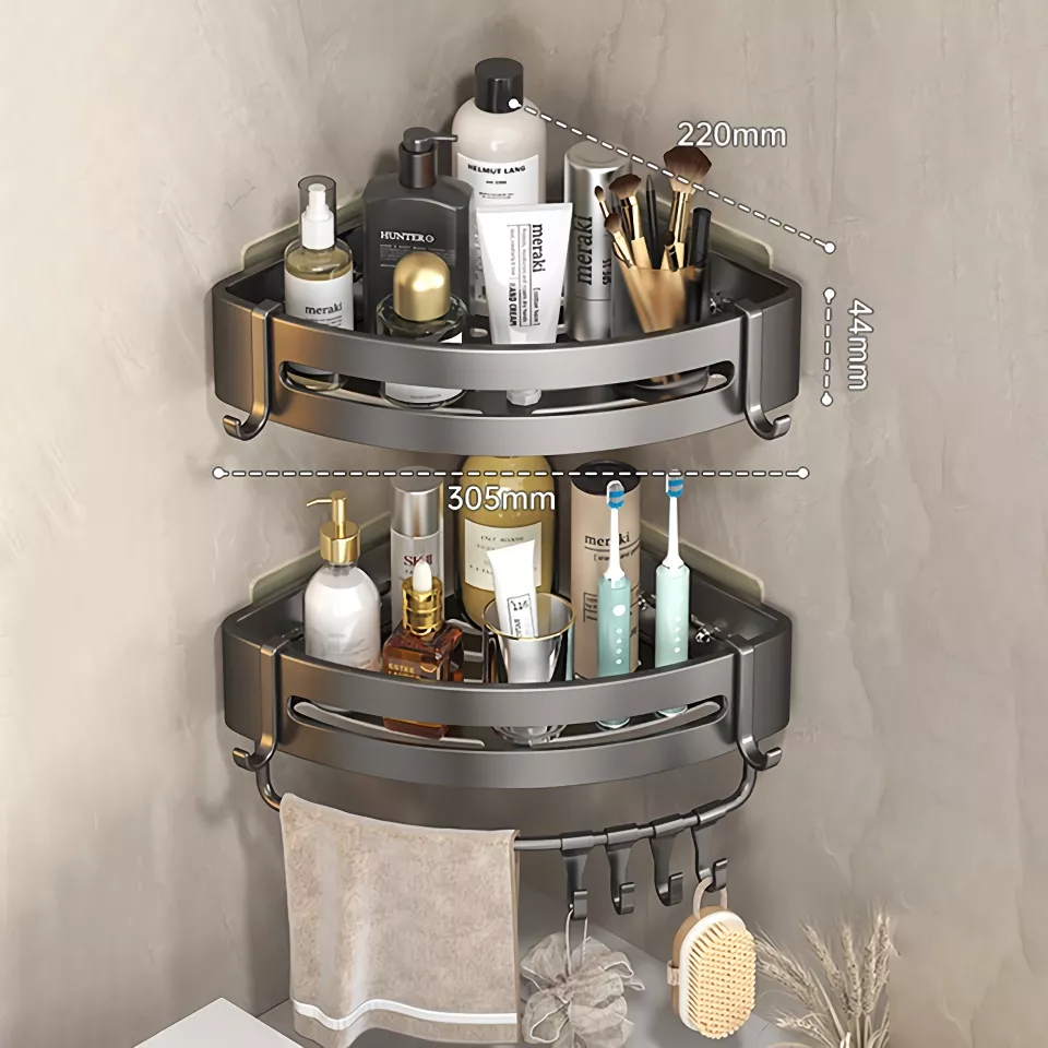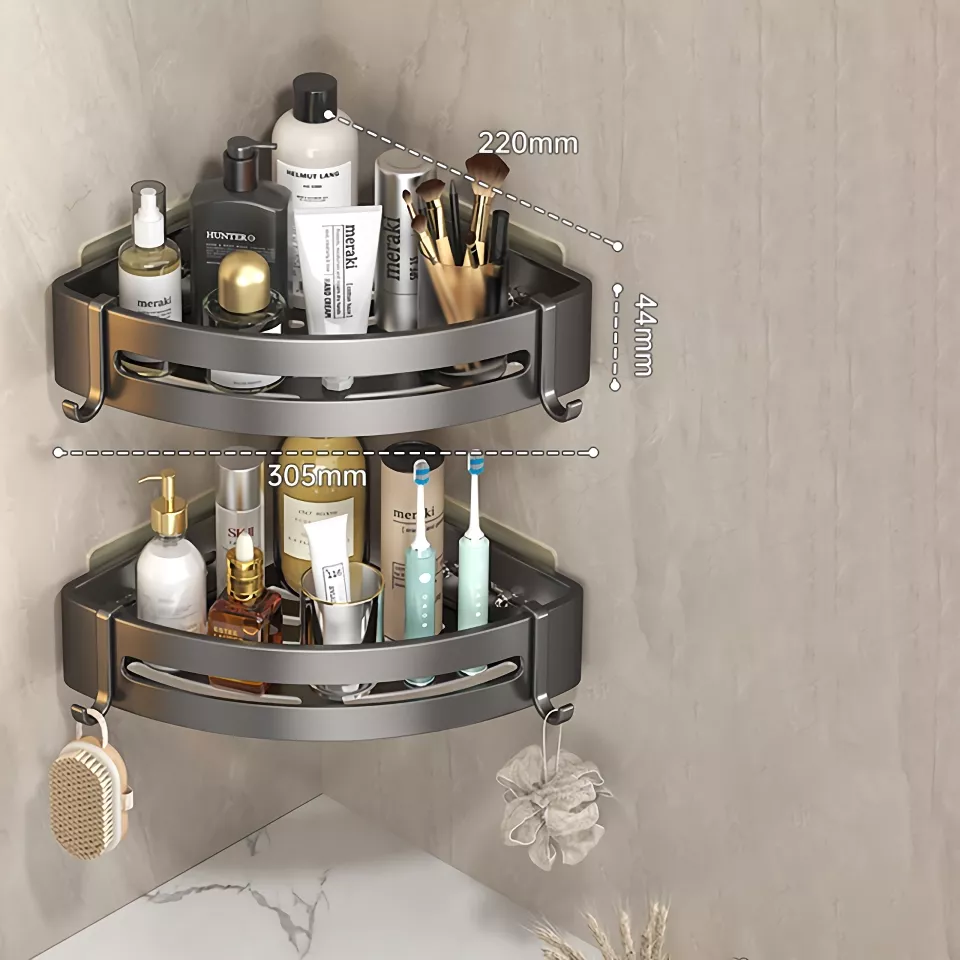 The sleek grey design of the Adhesive Bathroom Shampoo Holder complements any bathroom decor. Its dual-tier design provides ample storage space, allowing you to keep all your bathroom essentials within easy reach. The corner-mounted style maximizes your space, making it perfect for small bathrooms or showers where every inch counts.