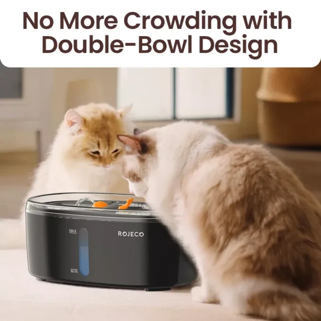 •  Double Bowl Design: Ideal for households with multiple pets, the double bowl feature allows both your cat and dog to drink simultaneously, reducing competition and stress.