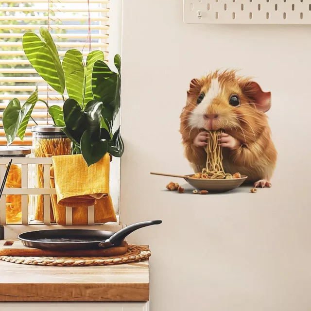 This adorable hamster wall sticker is designed to bring a smile every time you see it. Measuring about 10.6 inches square, it’s perfectly sized to add character without overwhelming your space. The hamster’s cheerful face and noodle-slurping pose make it the ideal addition for a kitchen wall, cabinet, or even a child’s room. Not only does it add personality, but it’s also an instant conversation starter. Great for adding a whimsical touch to your dining area, it’s perfect for homes, restaurants, or anywhere that could use a bit more fun!