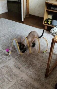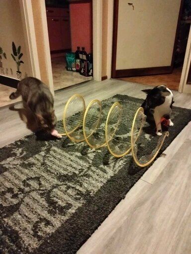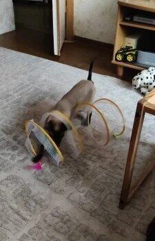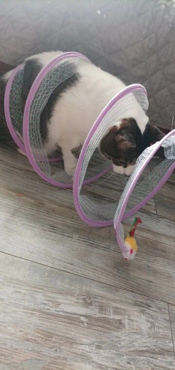 This tunnel has been a hit with my cats. they love running through it and playing hide and seek. the material is sturdy and the crinkly texture adds an extra layer of fun. it was easy to set up and is lightweight enough to move around the house. it also folds up nicely when not in use. my cats are more active and entertained since we got this. it's been a great addition to their playtime. i’m very happy with this purchase and recommend it to other cat owners.
