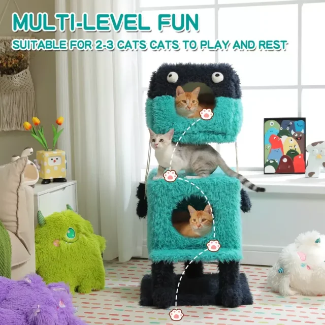 this cat tree has completely transformed my cats' playtime. they absolutely love climbing all the different levels, and the condos have become their favorite nap spots. the scratching posts are incredibly durable, which has saved my furniture from their claws. the design is adorable, with a playful monster theme that fits perfectly in our living room. it’s also really sturdy—both of my cats climb it at the same time, and it doesn’t wobble or tip over. the materials are soft but seem durable, and the whole thing was really easy to assemble. my cats have been using it non-stop since it arrived, and i love seeing them so happy. i’m also impressed with how well it fits into our space without being too bulky. it’s the perfect combination of play, comfort, and style. highly recommend for anyone with multiple cats!