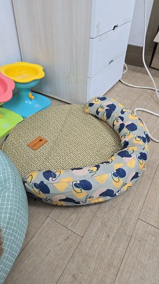 Crafted with your pet’s comfort in mind, this dog bed combines premium materials to ensure a refreshing and cozy experience. The breathable construction includes PP cotton, sponge, a rattan mat, and ice silk material, offering a soft yet supportive surface. The heightened edges are designed to protect your pet’s neck, making it perfect for both restful sleep and lounging.