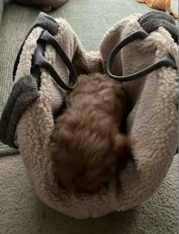 Increase the bag’s width and comfort by attaching the front leather handle to the bottom. Use the side pockets for storing toys and treats.