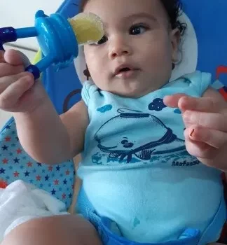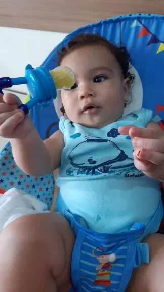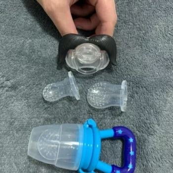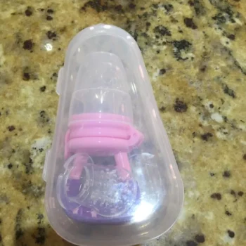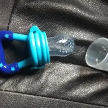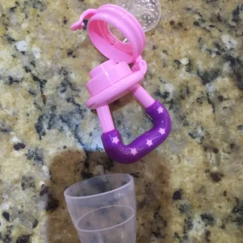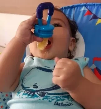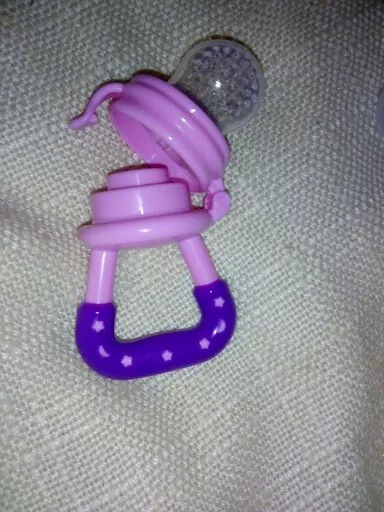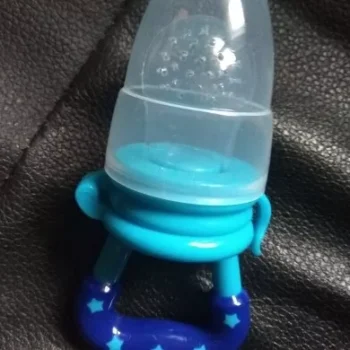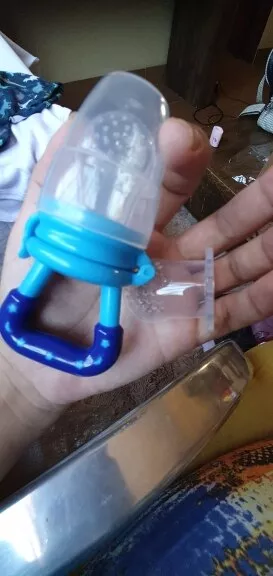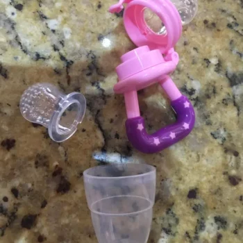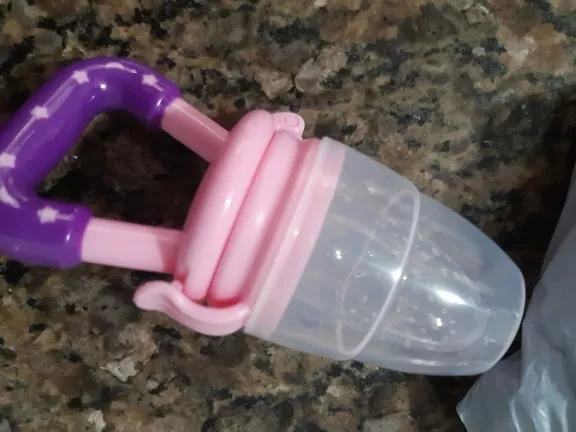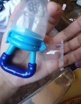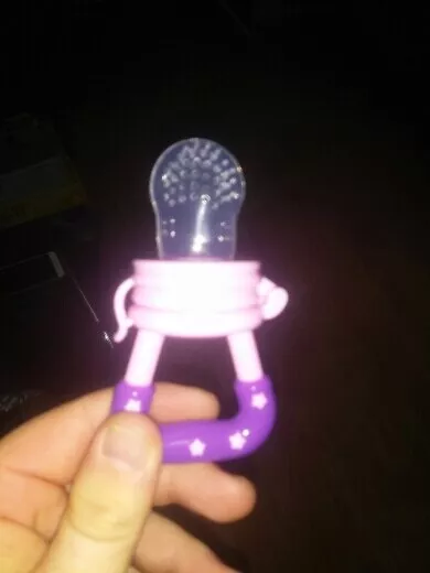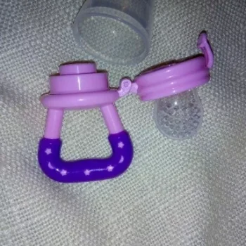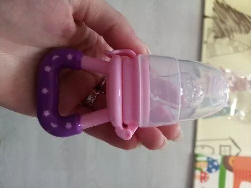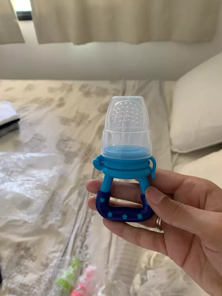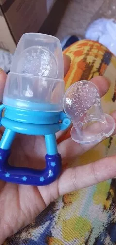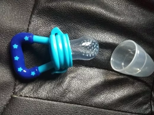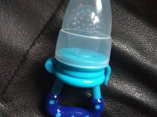 Got this for my 5 month old who just started trying food and has been teething since 3 months with no progress. I used the smallest one with frozen blueberries and she loved it. She can hold it herself with little help and I love that it can be cleaned very easily. We had a mesh feeder and tossed it because it is so hard to clean really well and just gets floppy and gross when the food thaws. This is a much better alternative and great price. My only concern is that the nipple piece can be removed too easily but hasn’t caused any issues yet.