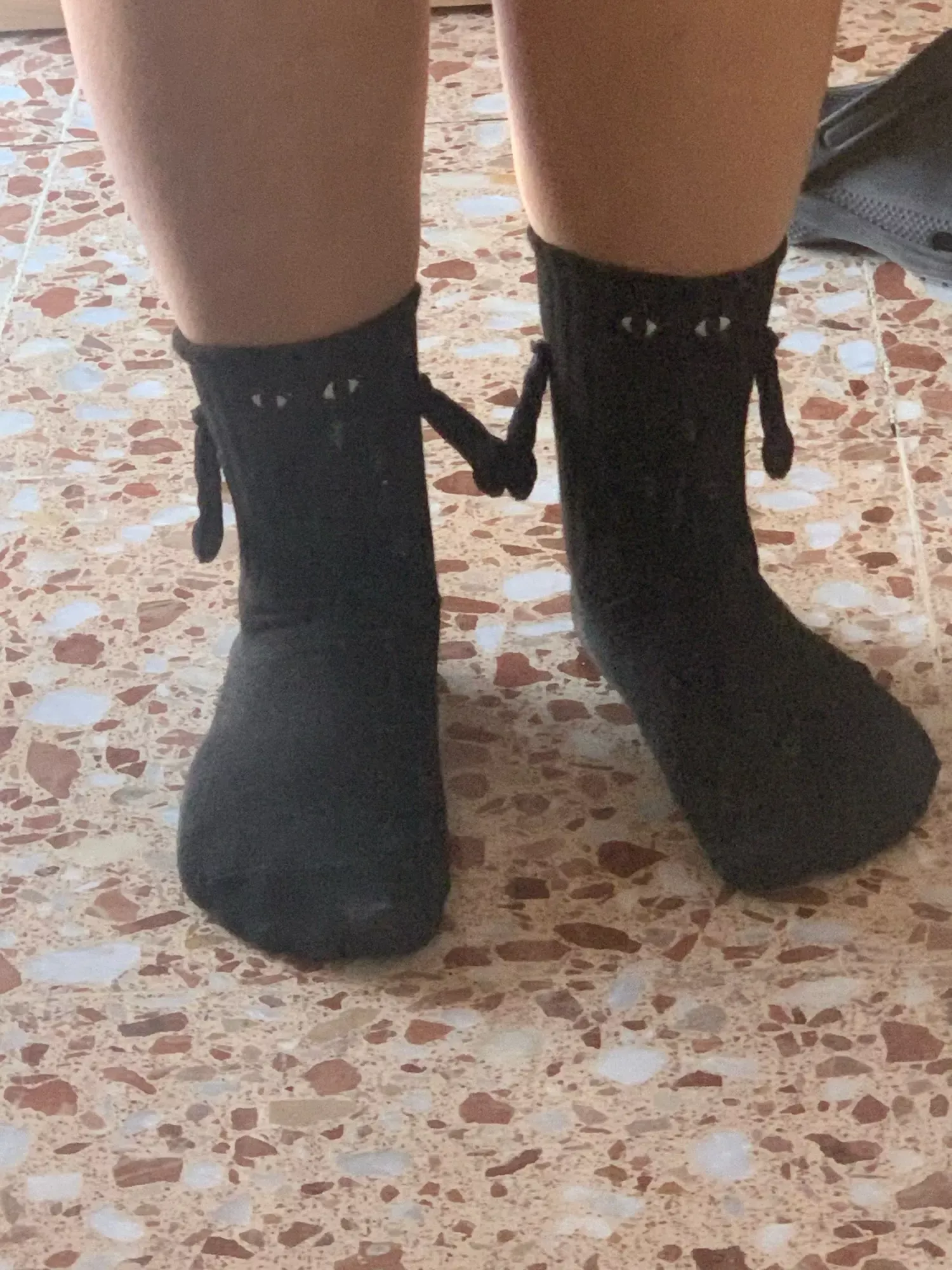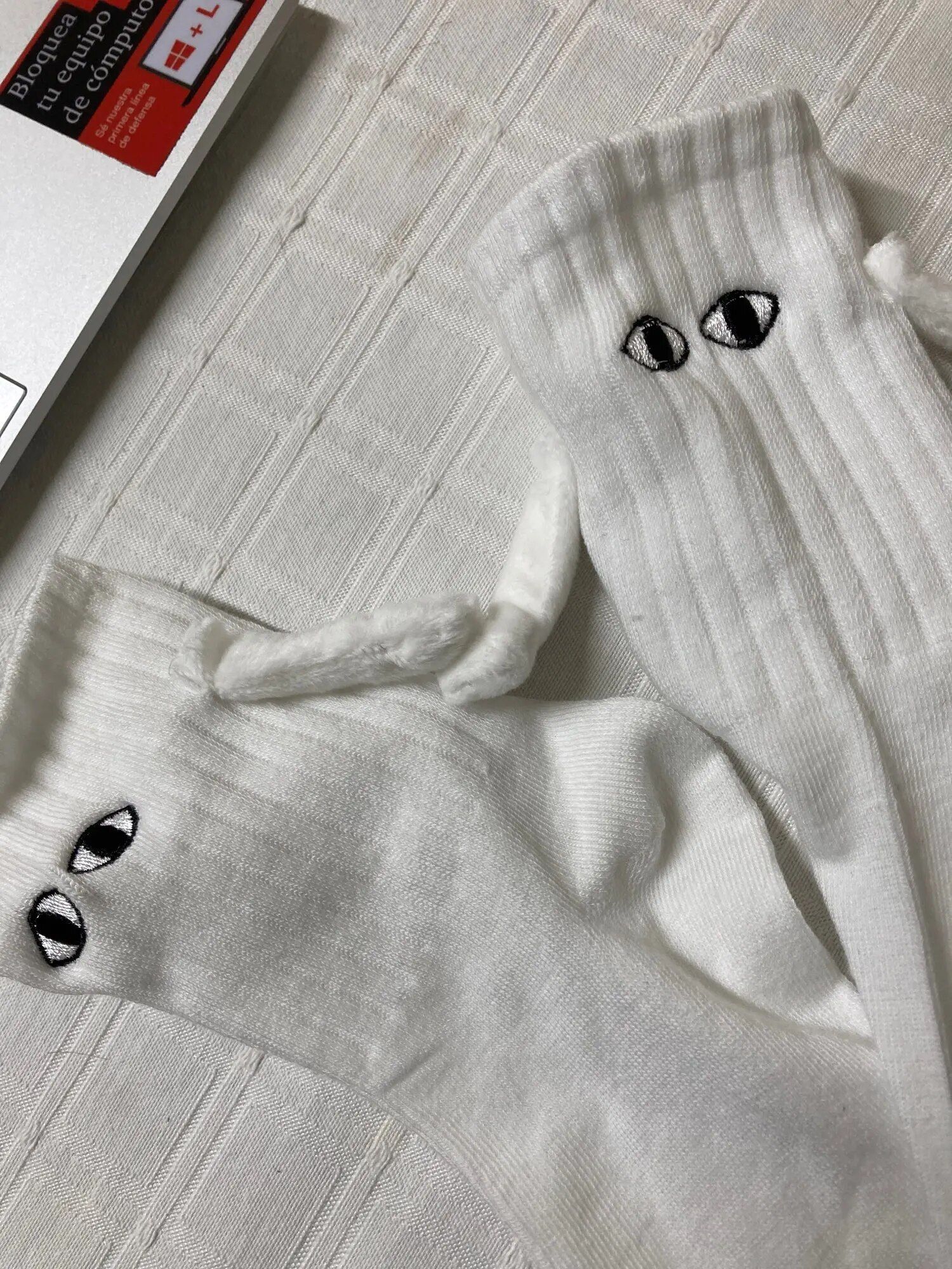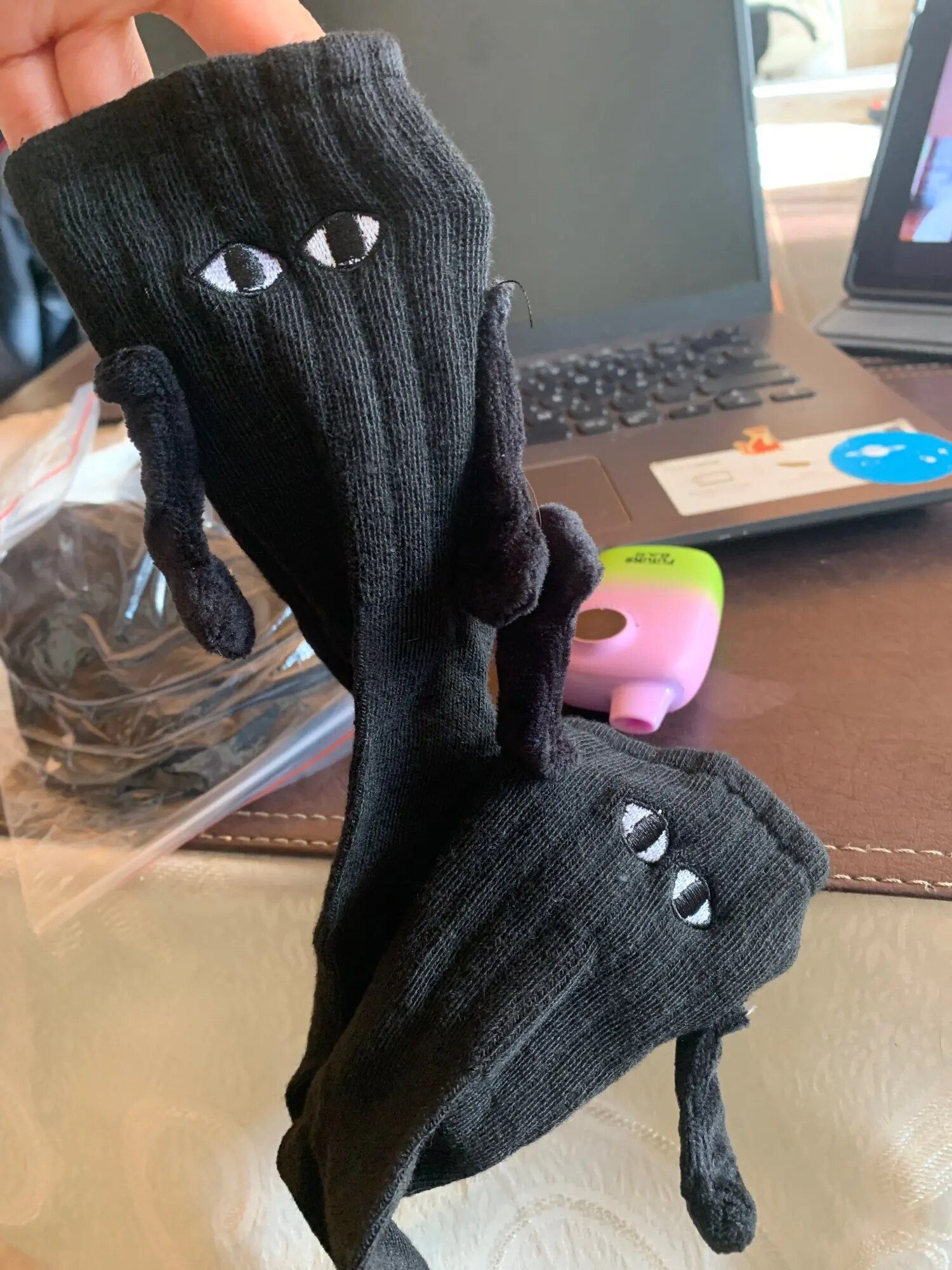 These socks are absolutely adorable—I ordered both the black and white pairs. Each one has slightly different eye designs, adding to their charm. The flexibility to attach their hands to either color is a fantastic feature, making them perfect stocking stuffers!