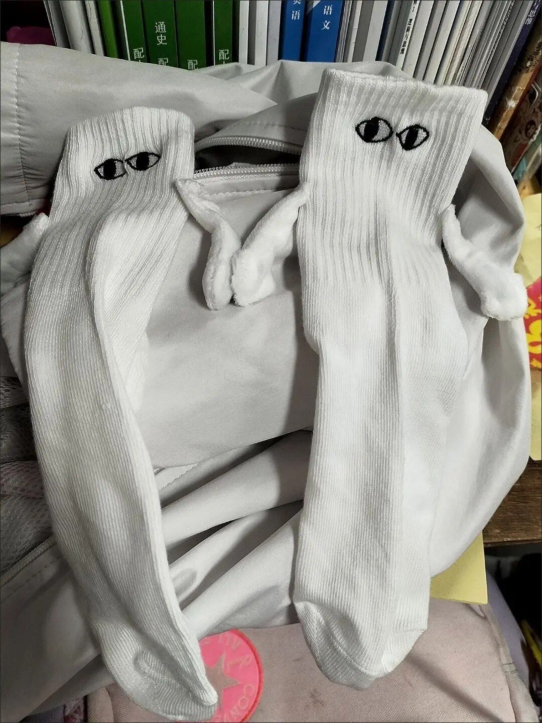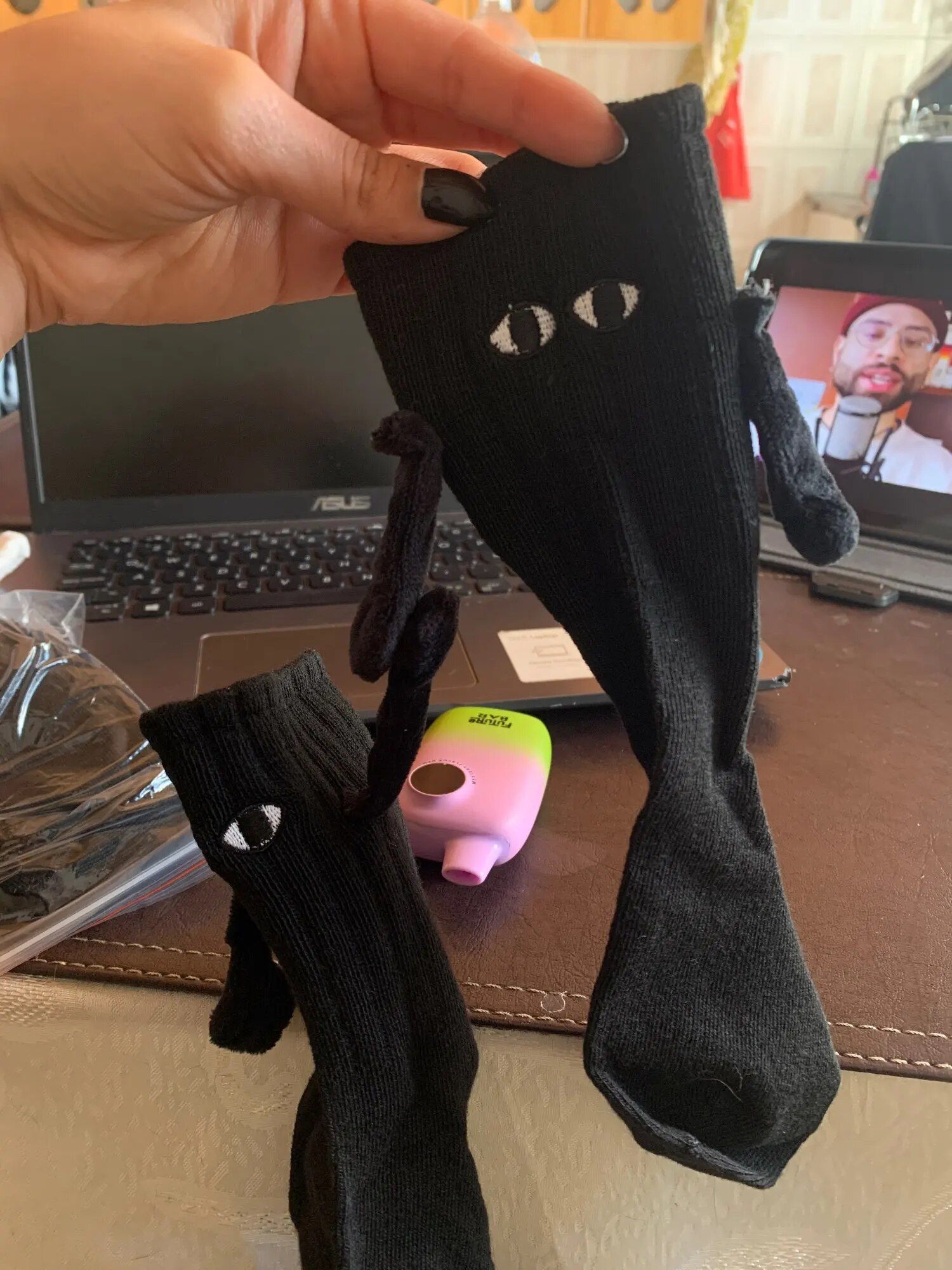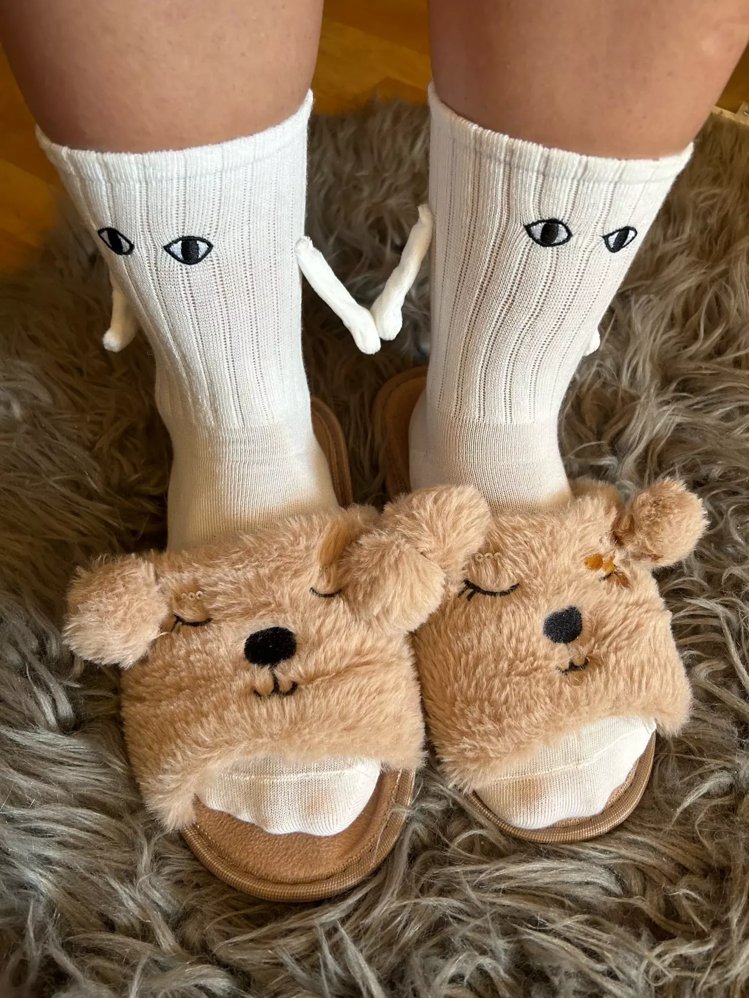 These socks are absolutely adorable—I ordered both the black and white pairs. Each one has slightly different eye designs, adding to their charm. The flexibility to attach their hands to either color is a fantastic feature, making them perfect stocking stuffers!