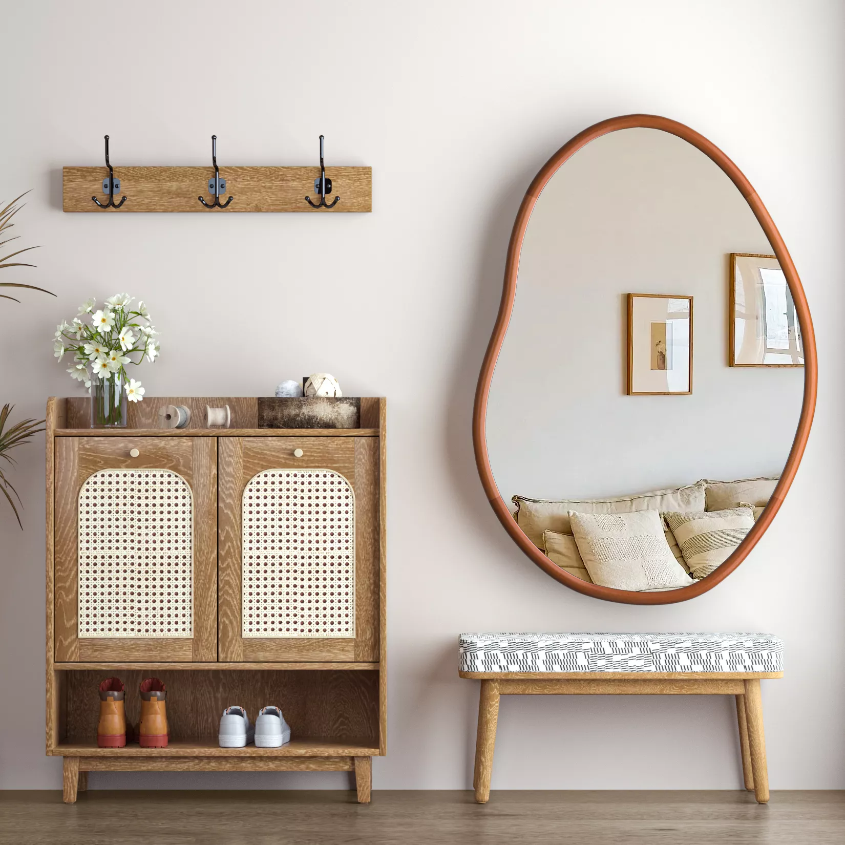 Unlike traditional mirrors, this unique piece captures attention with its asymmetrical shape, adding depth and creativity to your space. Crafted from solid beech wood, the frame is robust and durable, ensuring longevity. The mirror itself is made from copper-free resin silver glass, providing a clear, undistorted reflection. Hand-polished treatment and an anti-rust design ensure that it remains pristine over time.