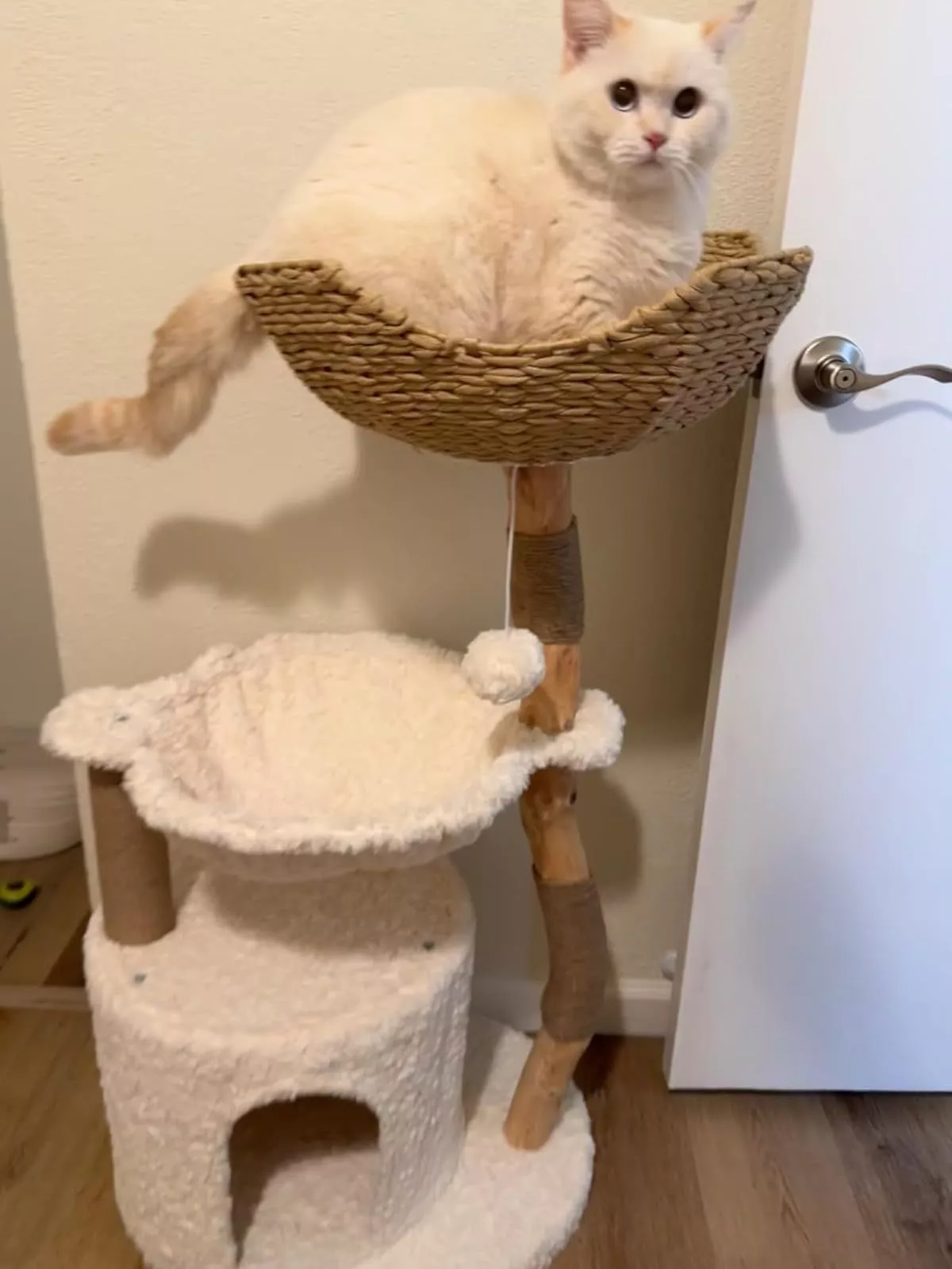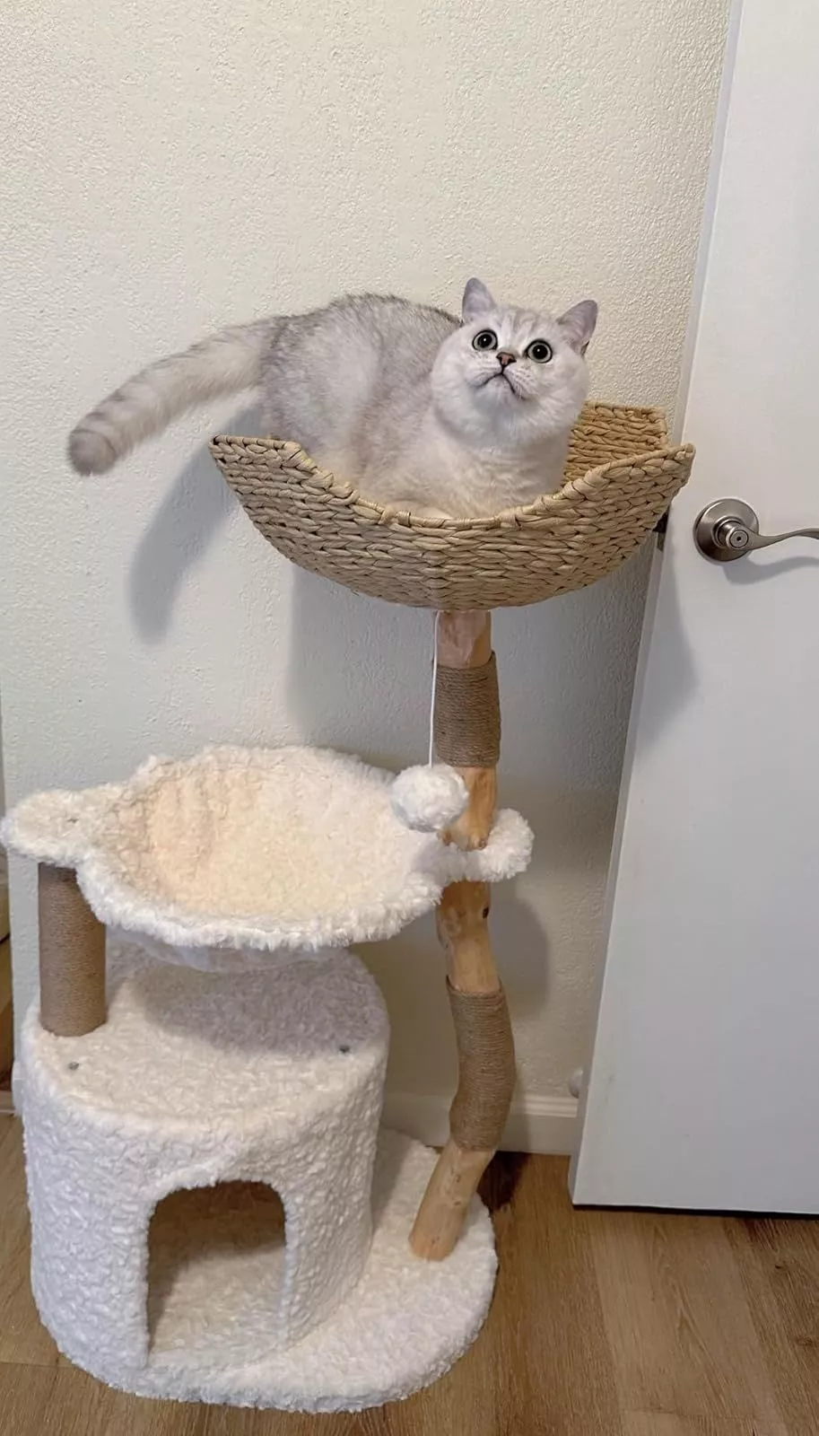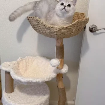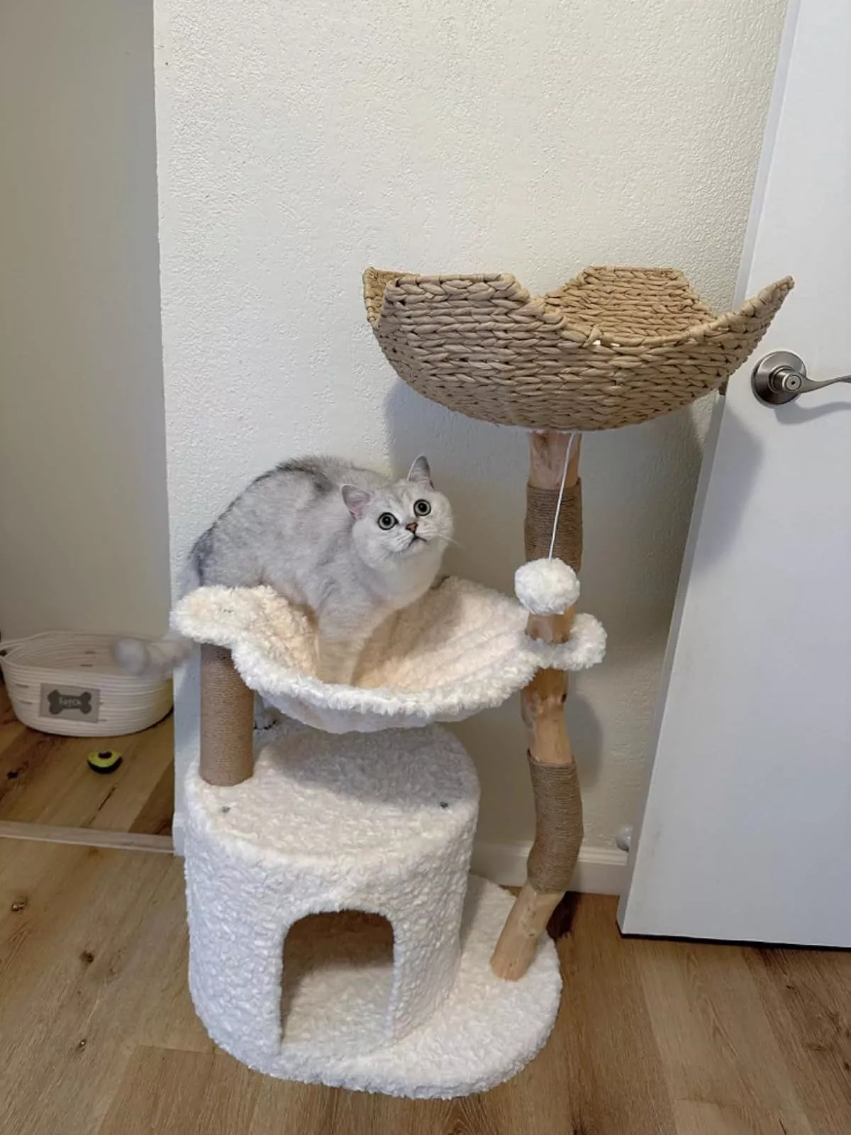 I've been on the hunt for a cat tree that not only serves its purpose but also blends in with my home decor, and I finally found it! This modern cat tree is absolutely perfect. It's stylish enough to be mistaken as part of our furniture collection, yet functional enough to keep my large indoor cats entertained all day long. The woven basket has become their favorite hiding spot while the hammock is where they lounge most afternoons. And let's talk about the solid wood scratching post - what a lifesaver! My cats love it and have completely stopped clawing at our couches. Also, I must comment on how durable this thing is; despite constant use by two hefty felines, it still looks brand new which speaks volumes about its quality construction. All in all, this product ticks all boxes for me - aesthetics, functionality and durability! 👍👍👍