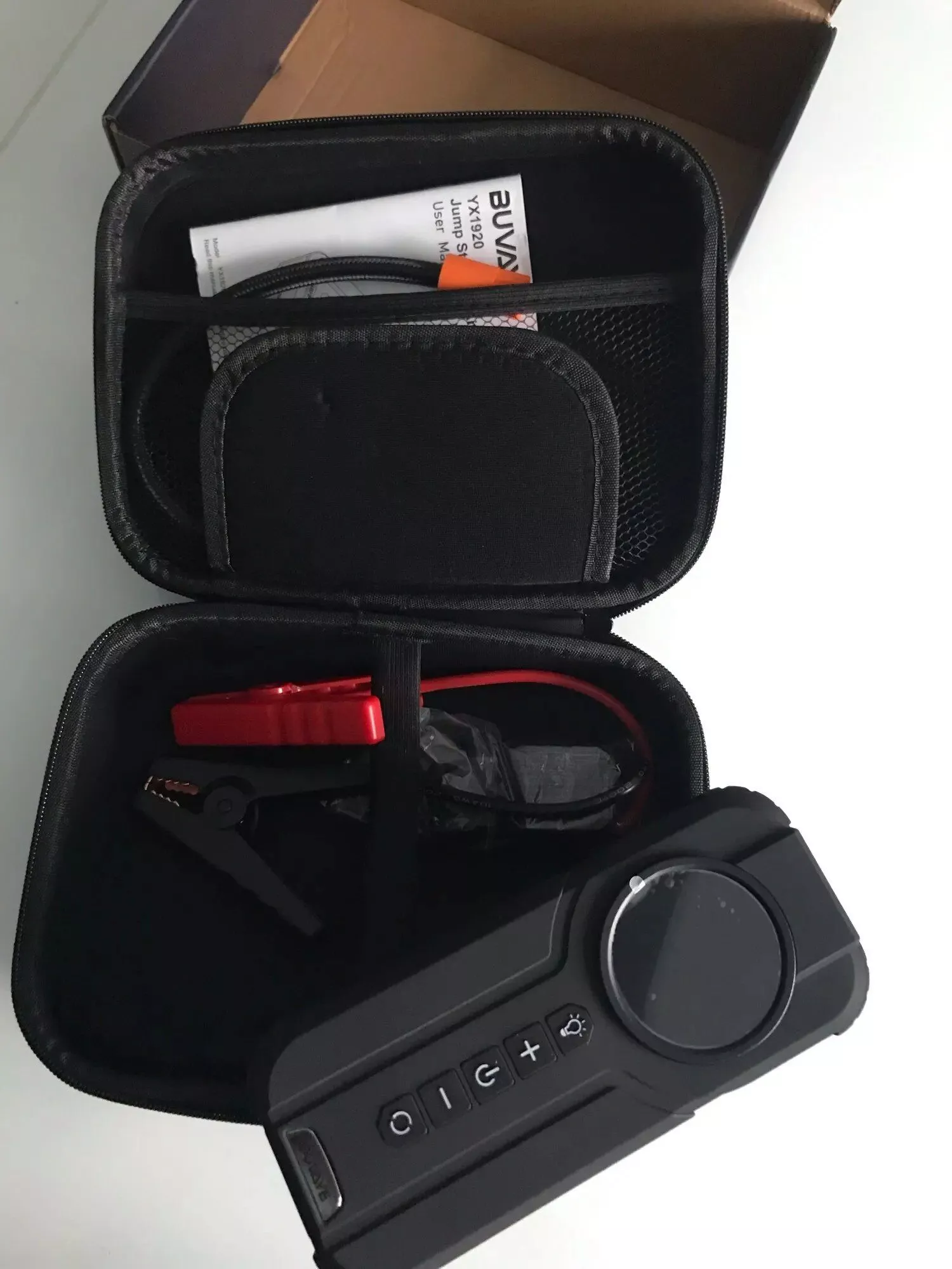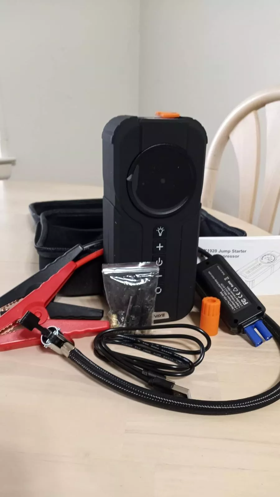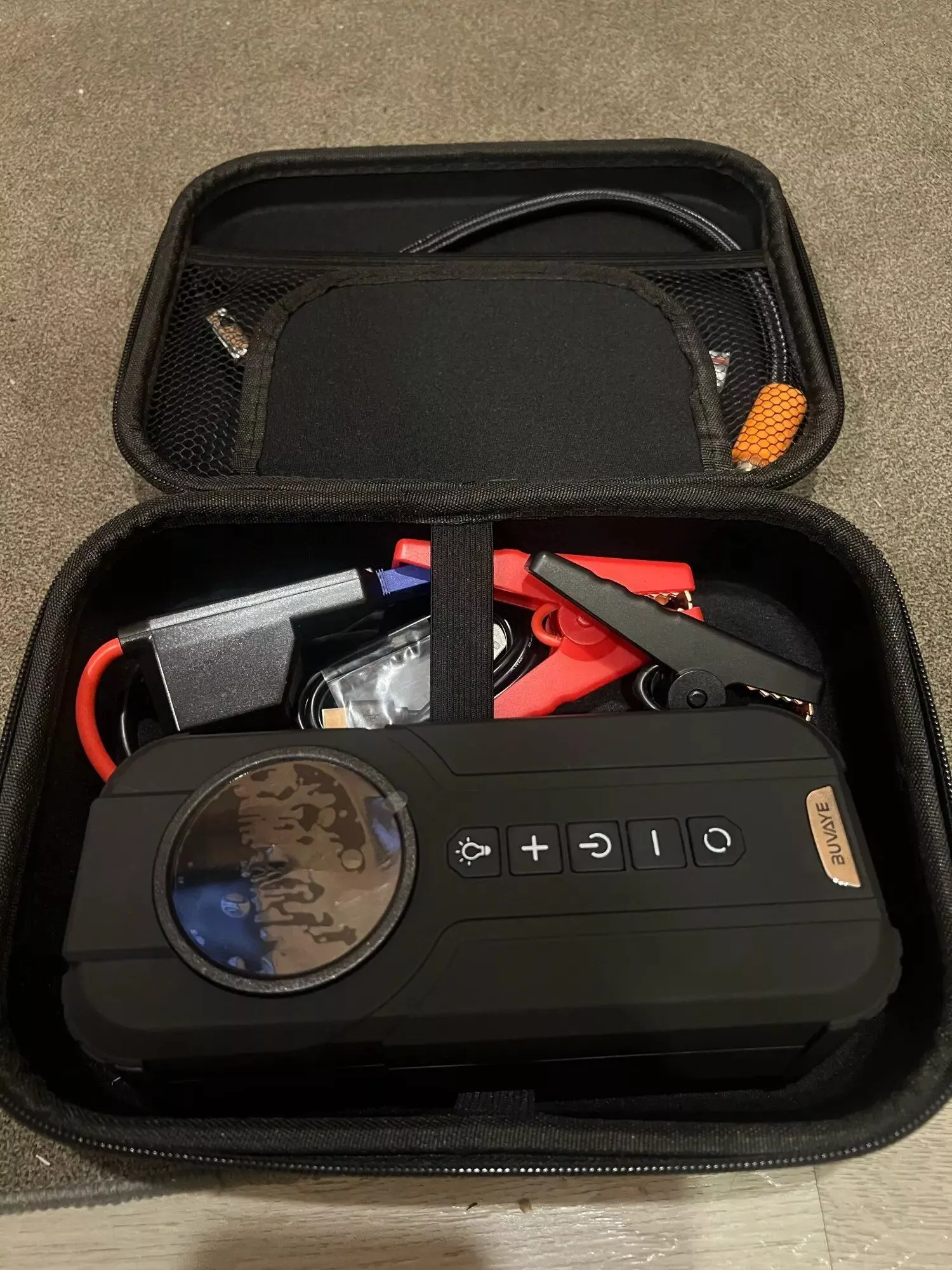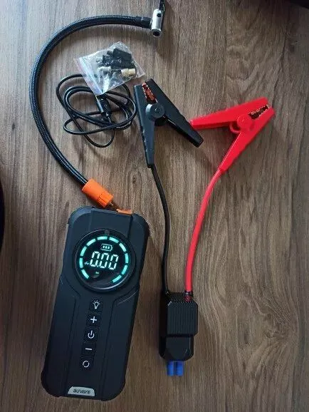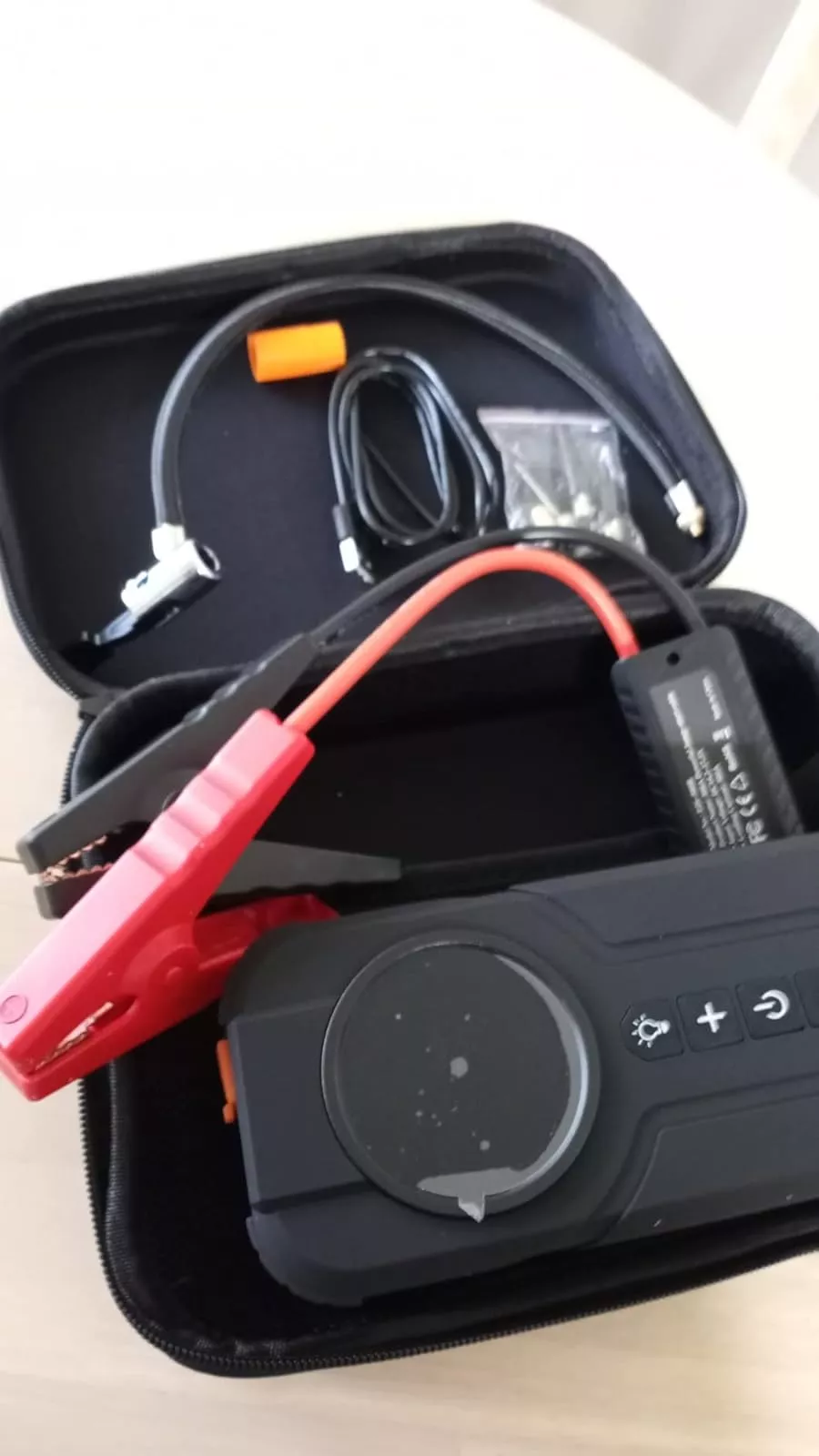 ❤️❤ Ergonomic and easy to hold ❤️❤ Small size ❤️❤ No wires, charges up (comes with USB cable) ❤️❤ Screen easy to read ❤️❤ Simple to use buttons ❤️❤ Does 4 things: starts cars (12V), pumps air, lights up, charges devices (USB C and A) ❤️❤ Cable with clips for battery (marked + and -) ❤️❤ Air pump for cars, bikes, motorcycles, balloons (shows PSI, BAR, etc.) ❤️❤ You can set the air pressure ❤️❤ Different attachments for filling air ❤️❤ Light with 3 settings: steady, flashing red/blue, and red S.O.S. ❤️❤ Light turns off by itself after 30 minutes ❤️❤ Charges up quick in 5 hours, shows battery level ❤️❤ Comes with a case to carry and keep it 👎 Needs charging every 3 months to keep battery good 👎 Won't work while plugged in 👎 A must-have in your car for emergencies or just to pump tires. Set the pressure, and it does the rest. It's really well-made, I recommend getting one!