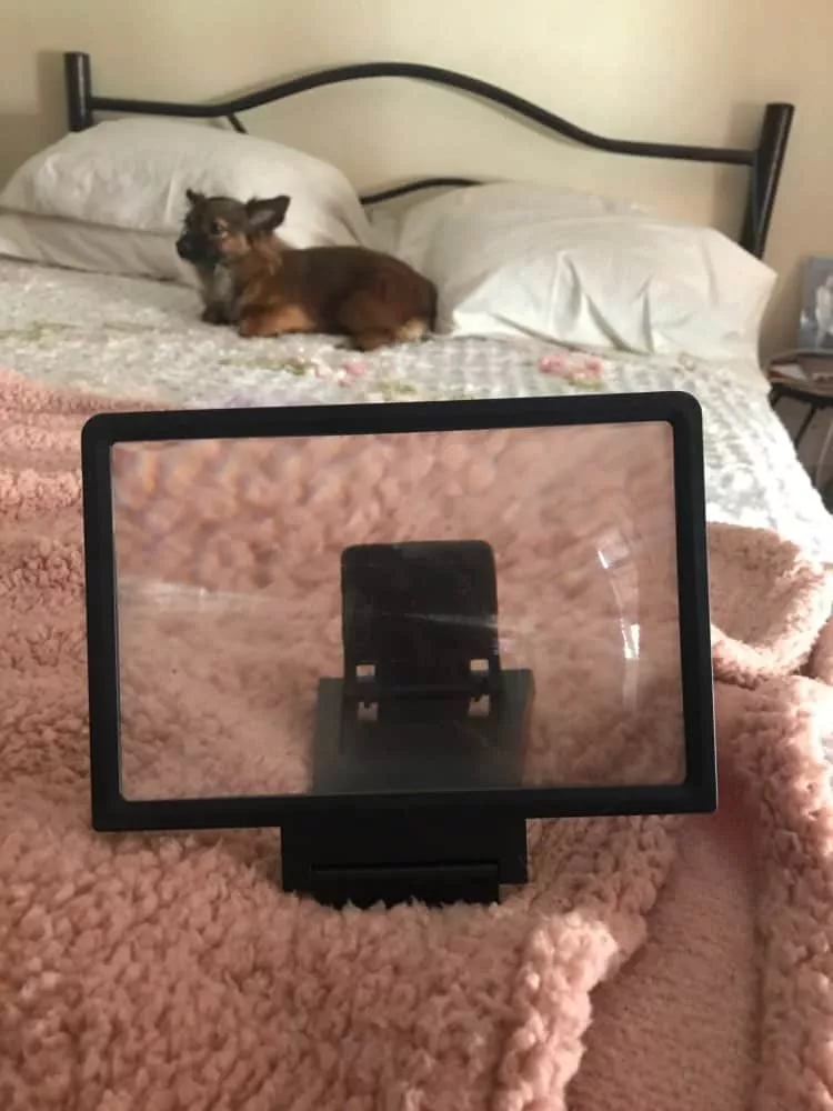 This is a neat gadget to have if you use your phone a lot to watch movies and TV. It’s clear when it magnifies. I have an iPhone 11 Pro Max with a case. I keep the case on (to answer one person’s question). It’s foldable, so it stores easily. I honestly just put it on my chest and watch it while I’m in bed. When I’m done, I fold it up and put it in my night stand. For the price, and to help save your eyes, I recommend this.