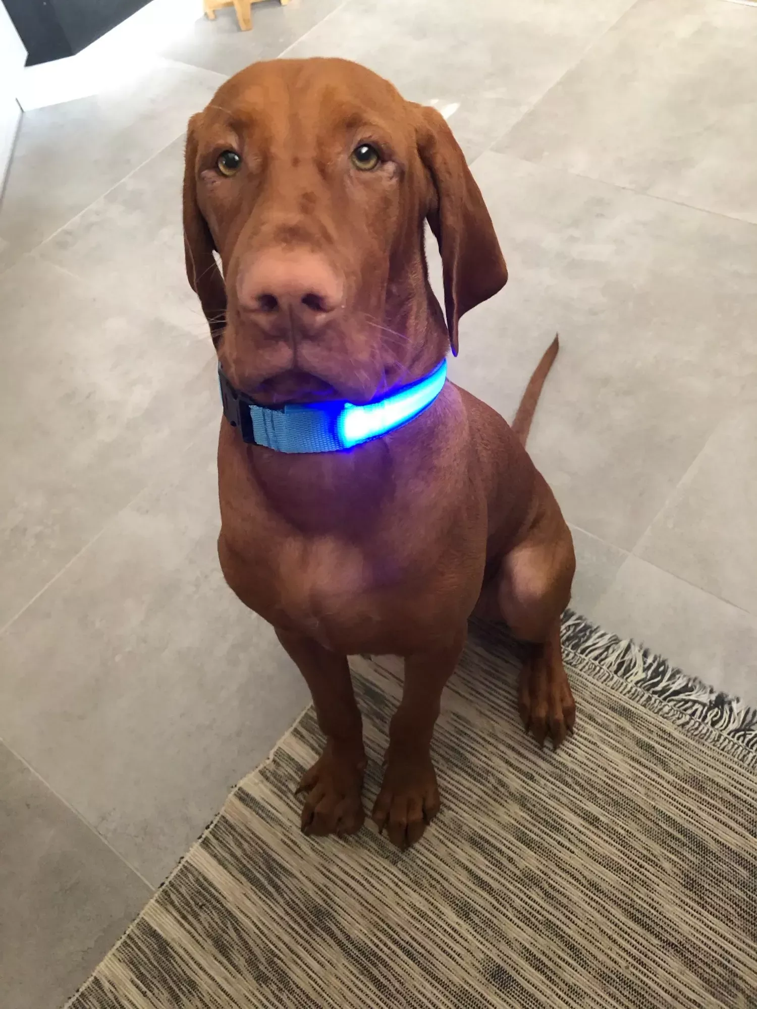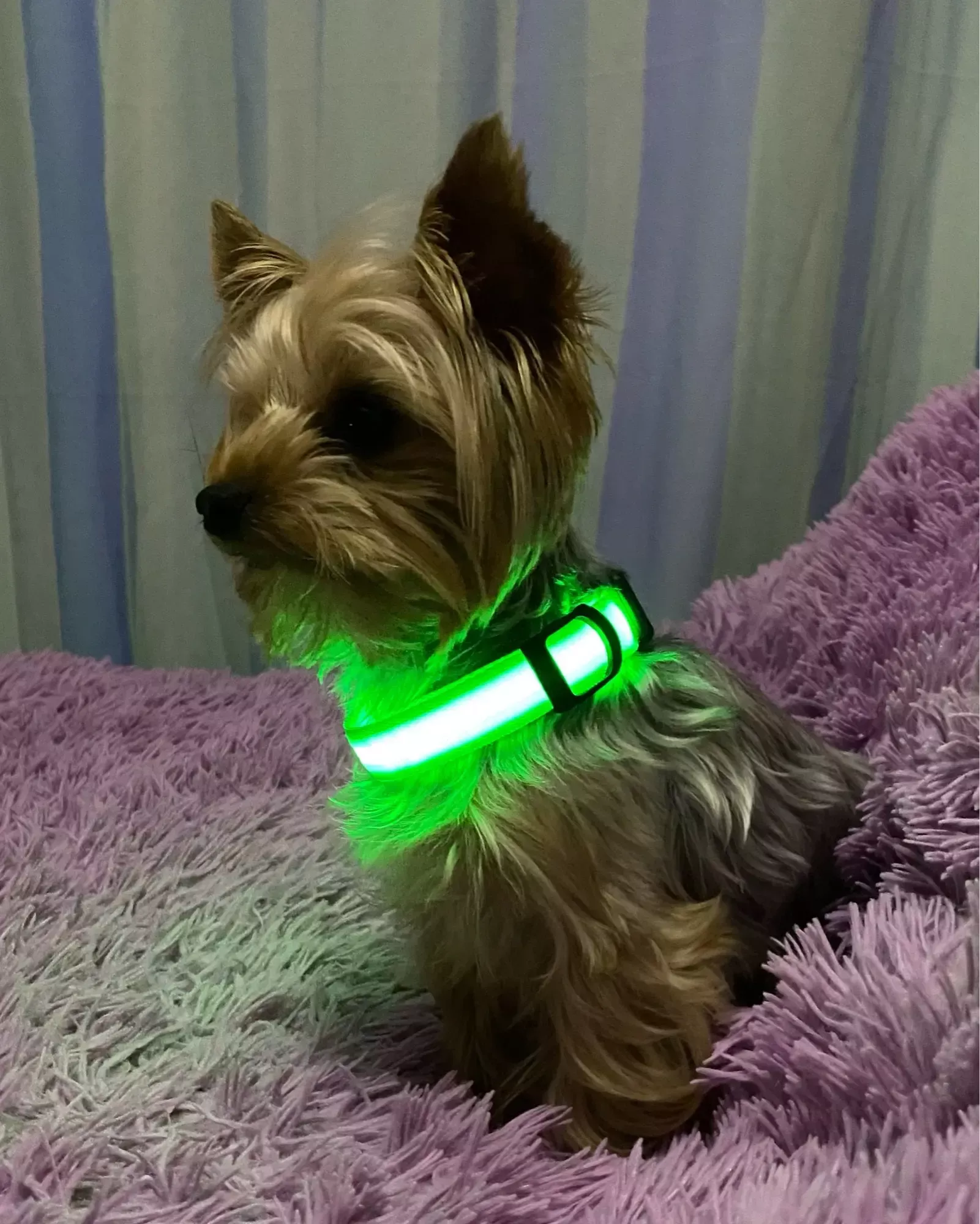 When in use, the collar emits a strong, visible light, perfect for city walks at night.