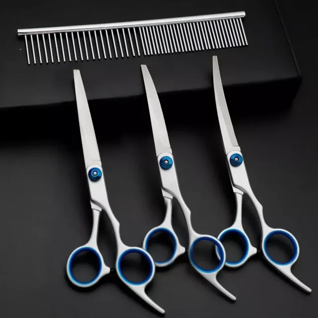 This grooming set is ideal for keeping your pet’s coat neat and comfortable between grooming appointments. Use the thinning shears for reducing bulk, straight scissors for shaping, and curved scissors for precise cutting around the face and paws. The stainless steel comb is perfect for detangling and preparing the coat, making each grooming session smooth and stress-free. This set is designed to handle all aspects of pet grooming, from basic maintenance to detailed trimming.