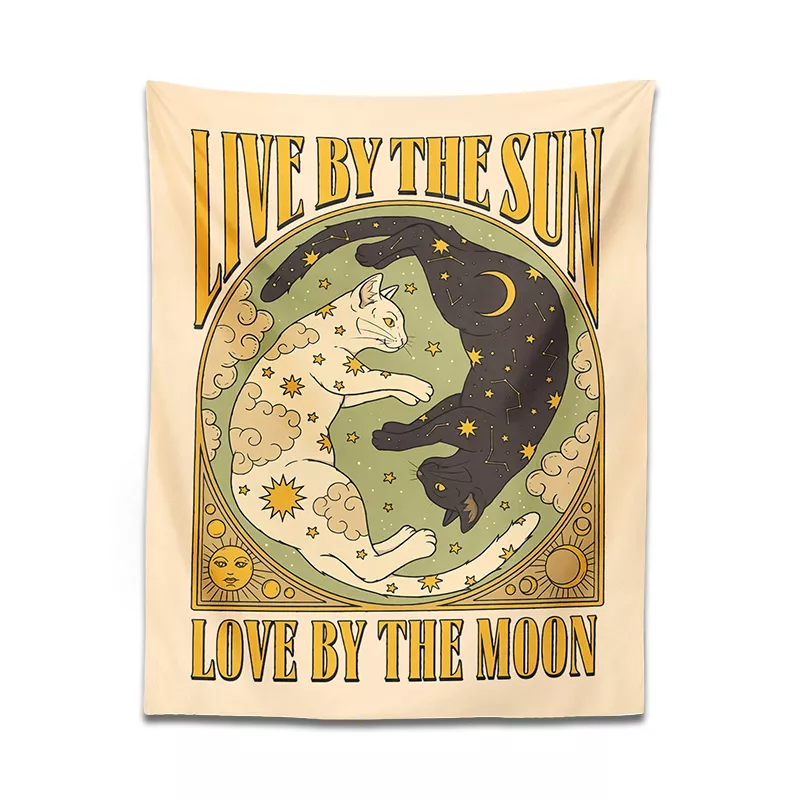 Bring a touch of mystical charm to your living space with our Sun Moon Cat Tapestry Wall Hanging. This stunning piece features an enchanting black and white design that captures the serene beauty of the sun, moon, and a pair of whimsical cats. Perfect for adding a retro, psychedelic vibe to your home, dorm, or any space that needs a little extra magic.