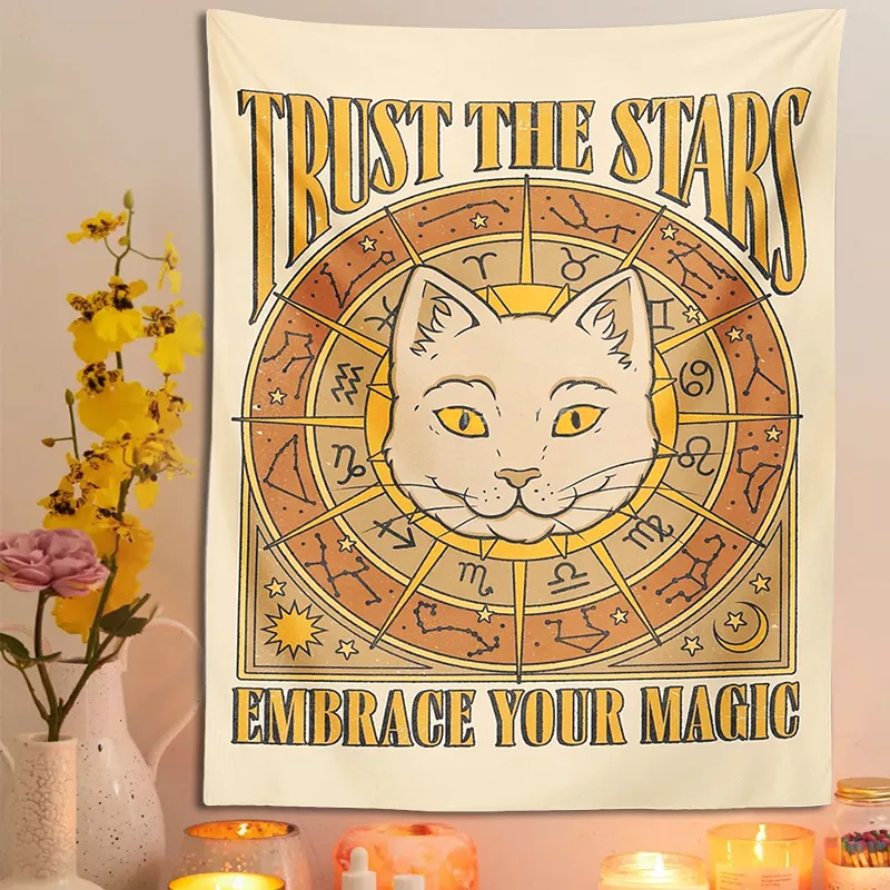 Whether you’re decorating your living room, bedroom, or dorm, this tapestry is the perfect addition to create a cozy and enchanting atmosphere. Its unique design makes it a great conversation starter and a wonderful gift for anyone who loves cats, astrology, or psychedelic art. The versatile nature of this tapestry allows it to be used as a wall hanging, bedspread, or even a picnic blanket, making it a functional and stylish piece.